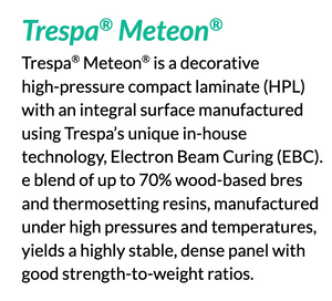 Trespa¨ Meteon¨ is a decorative high-pressure compact laminate (HPL) with an integral surface manufactured using Trespa's unique in-house Electron Beam Curing (EBC) and Dry Forming (DF) technologies. The blend of kraft paper and thermosetting resins, manufactured under high pressures and temperatures yields a highly stable, dense panel with good strength-to-weight ratios.